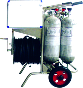 ·由减压装置、2根10米连接管、Y型三通接头、50米气管盘、低压报警器、压力显表、不锈钢小(xiǎo)車(chē),铝合金储存箱等组成,